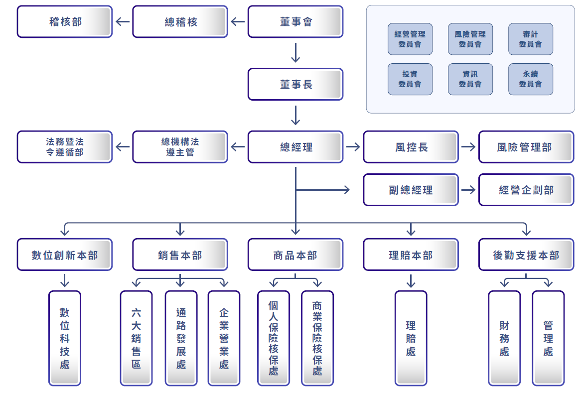 依據明台產物保險公司組織規程,董事會下設有審計委員會、經營管理委員會、風險管理委員會、投資委員會、資訊委員會及永續委員會等六個功能性委員會。其委員與職掌按各委員會組織規程辦理,並各自定期向董事會提出報告。更多公司治理詳細資訊,請至明台資訊公開參閱。