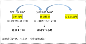 A:班機延誤期間之計算,係自預定搭乘班機之預定出發之時起,至實際出發之時或第一班替代班機實際出發之時止,若為同一事故時班機延誤、班機取消、班機失接之期間得合併計算。