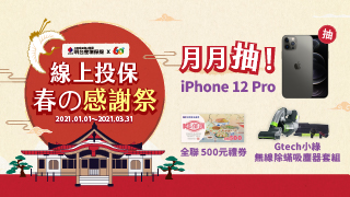 自2021年1月1日起至2021年3月31日止,期間內透過本公司『官網』網路投保及傳真要保,並符合本活動資格即可獲得抽獎機會。線上投保抽 iPhone 12 Pro,加碼再抽小綠吸塵器,投保好禮抽不完!