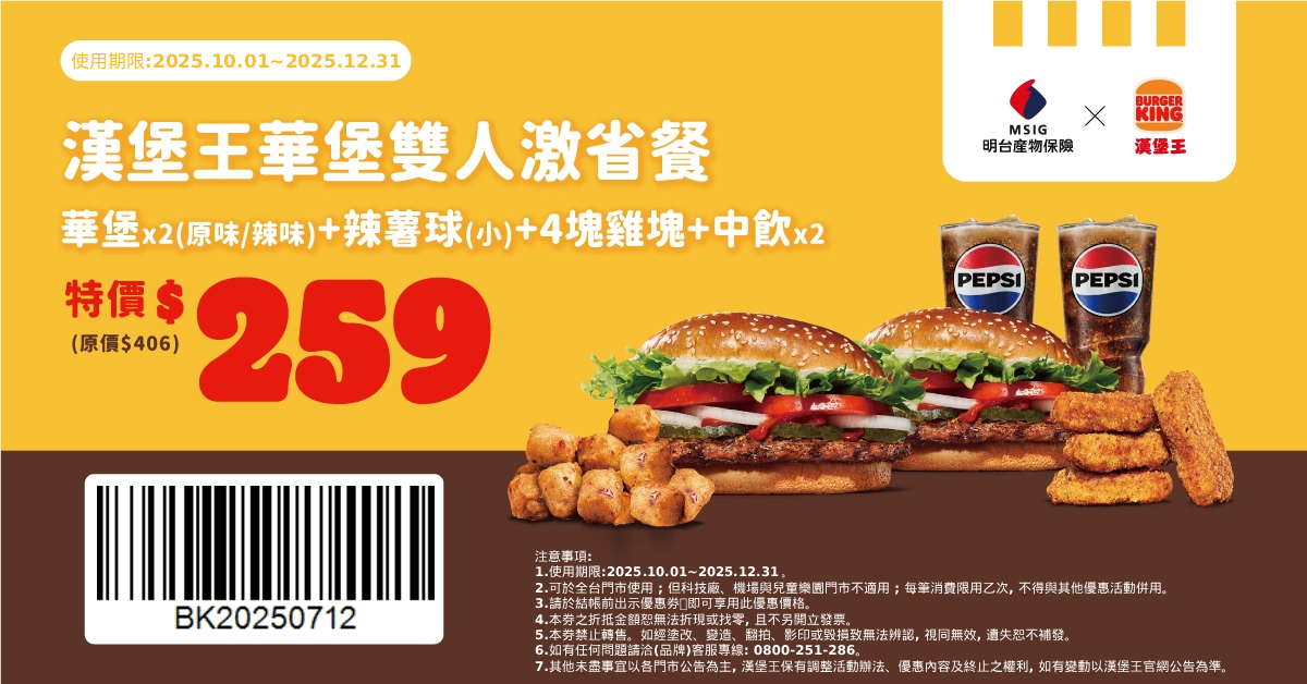 6. 其他未盡事宜以漢堡王各門市公告為主,明台產險與漢堡王保有調整活動辦法、優惠內容及終止之權利,如有變動以漢堡王官網公告為準。