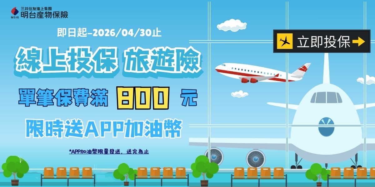 線上完成投保【旅遊險】單筆保費滿800元(含)以上,核保完成之保戶,送APP加油幣,限量10,000幣送完為止。