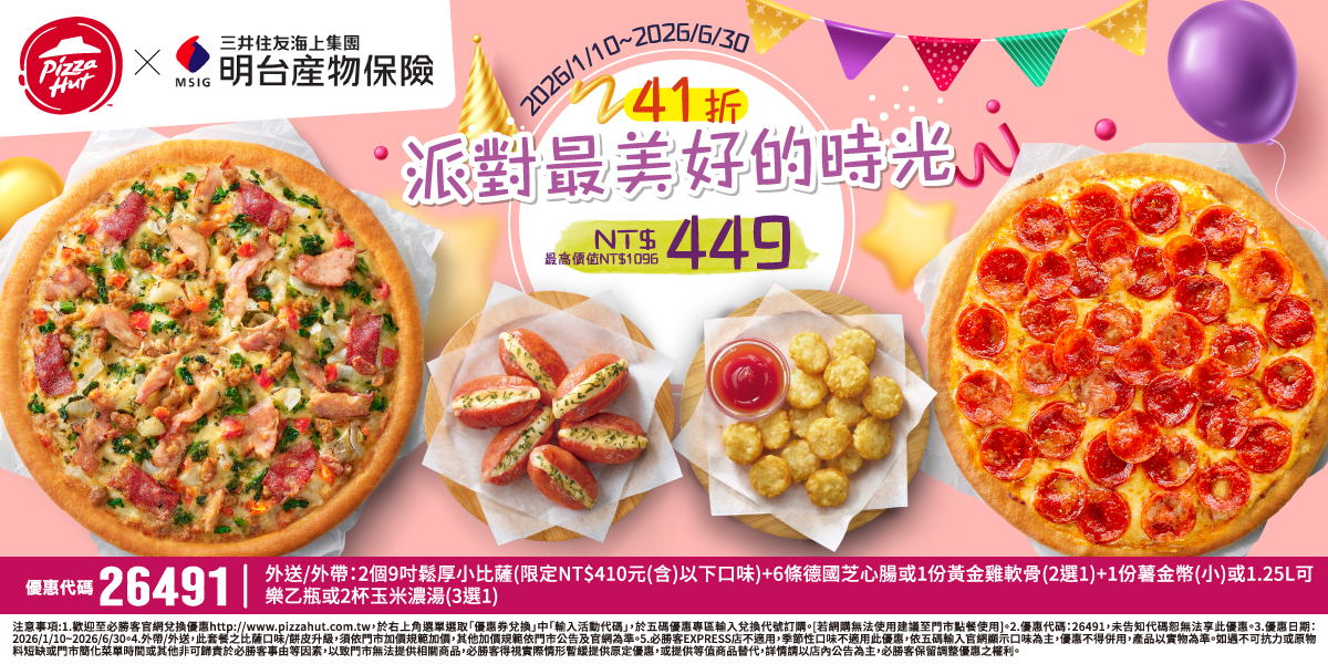※明台產物保險僅提供優惠訊息,涉及可歸責於必勝客之事由而滋生之優惠商品服務與消費者相關糾紛,概由提供商品或服務者負責。