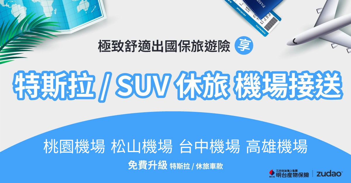 明台會員線上成功投保旅遊險不限金額,即享全台各縣市到各機場間,單趟新台幣優惠(請參考以下列表),且可以免費選擇「特斯拉或SUV休旅不限車款或同級以上車輛」。